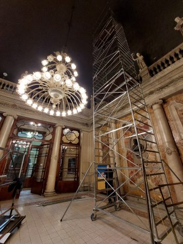 Sentito il parere della Soprintendenza Archeologia, Belle Arti e Paesaggio per le province di Bergamo e Brescia, la Fondazione del Teatro Grande ha quindi deciso di presentare un’integrazione al progetto di restauro originario con l’obiettivo di recuperare l’intera superficie dipinta della volta. Durante i lavori sono intercorsi altresì interventi di manutenzione sul maestoso lampadario in vetro di Murano della Sala delle Statue e sui radiatori storici in ghisa presenti nel vestibolo di collegamento con il Ridotto del Teatro.
